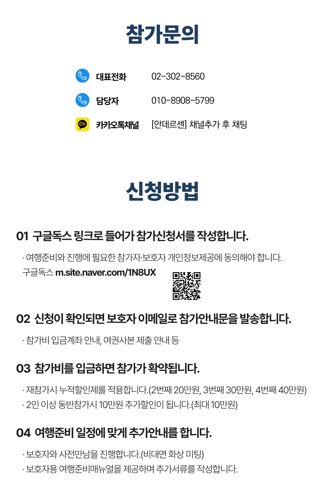 상세한 여행준비를 위해 구글 참가신청서를 작성해주셔야 합니다. 구글독스 참가신청서를 작성하지 않으면 정상적으로 예약이 접수되지 않습니다. 클릭하면 바로 구글 참가신청서로 연결됩니다.