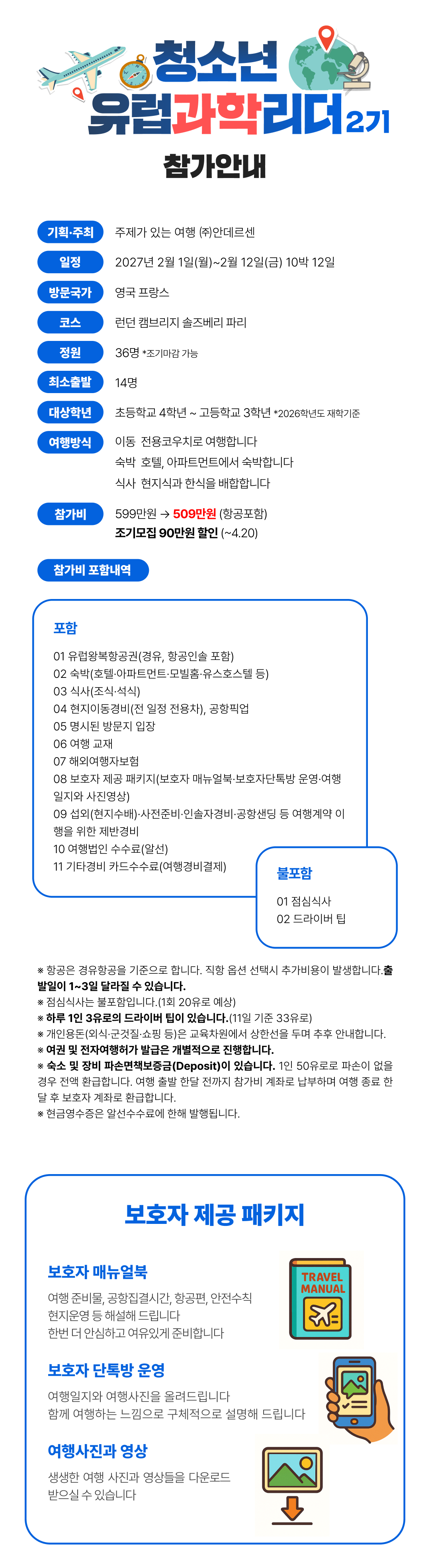 안전한 여행을 위해 주최측은 외교부 해외안전여행, 현지언론보도 등을 예의주시하며 예기치 않은 상황발생시에도 빠르게 조치를 취하고 있습니다. 이와 별도로 여행참가 전 해당 방문국의 여행안전경보, 예방접종 등과 관련해서는 보호자와 여행자 각자가 판단해야 합니다. 외교부 해외안전여행, 해외여행 질병정보 등의 사이트를 확인바랍니다. 어플을 설치하셔서 실시간 확인하는 것이 좋습니다. 비의료인은 의료조치를 할 수 없습니다. 주최측은 예방접종 등 의료적 권고는 하지 않습니다. 여행자가 스스로 판단해 진행 바랍니다.