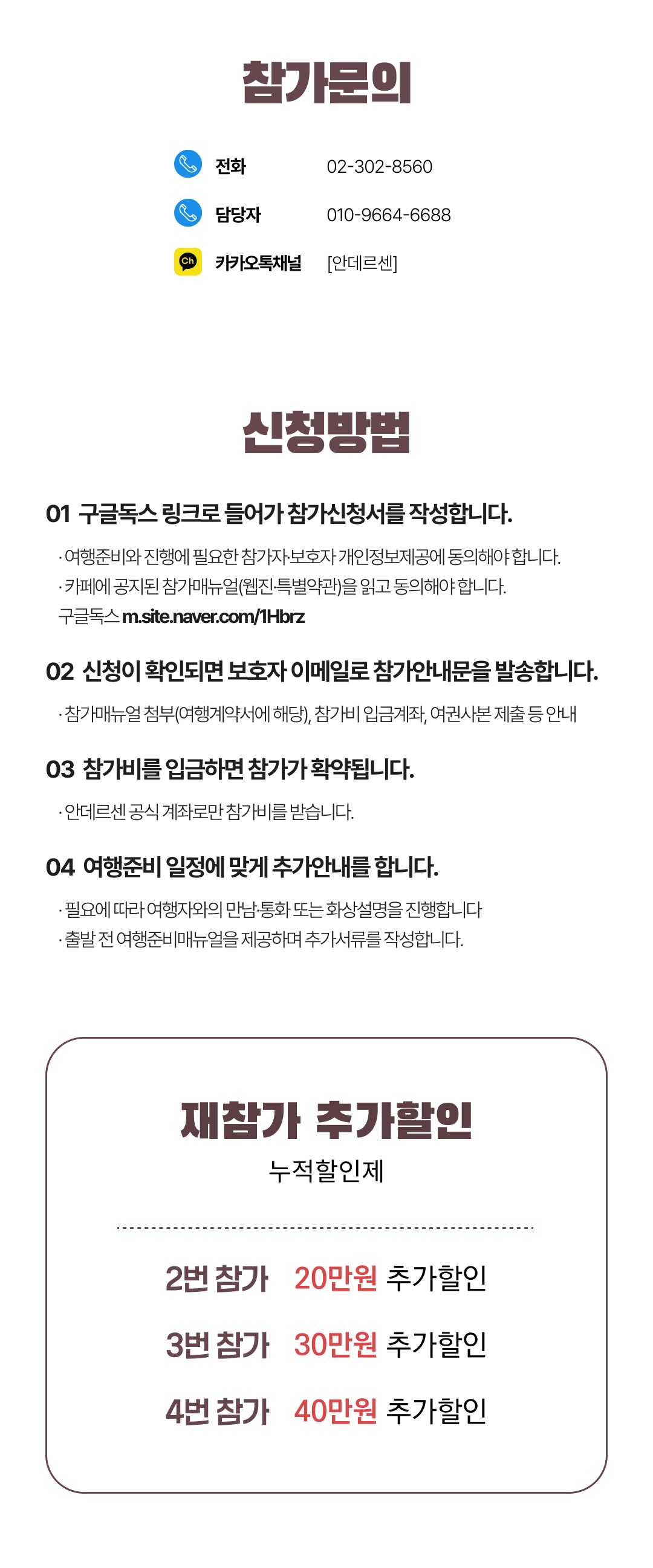 상세한 여행준비를 위해 구글 참가신청서를 작성해주셔야 합니다. 구글독스 참가신청서를 작성하지 않으면 정상적으로 예약이 접수되지 않습니다. 클릭하면 바로 구글 참가신청서로 연결됩니다.