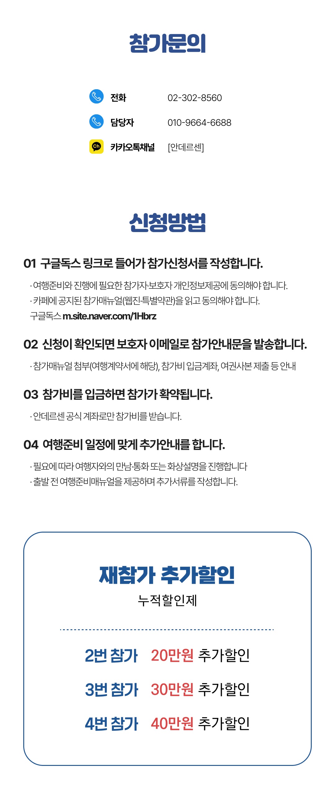 상세한 여행준비를 위해 구글 참가신청서를 작성해주셔야 합니다. 구글독스 참가신청서를 작성하지 않으면 정상적으로 예약이 접수되지 않습니다. 클릭하면 바로 구글 참가신청서로 연결됩니다.