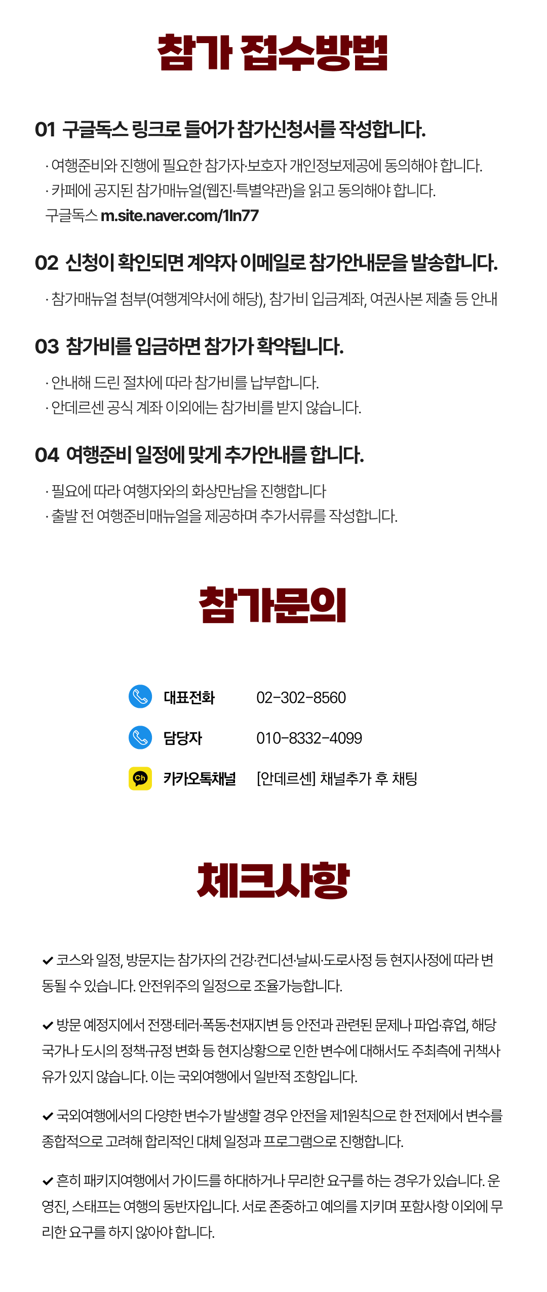 상세한 여행준비를 위해 구글 참가신청서를 작성해주셔야 합니다. 구글독스 참가신청서를 작성하지 않으면 정상적으로 예약이 접수되지 않습니다. 클릭하면 바로 구글 참가신청서로 연결됩니다.