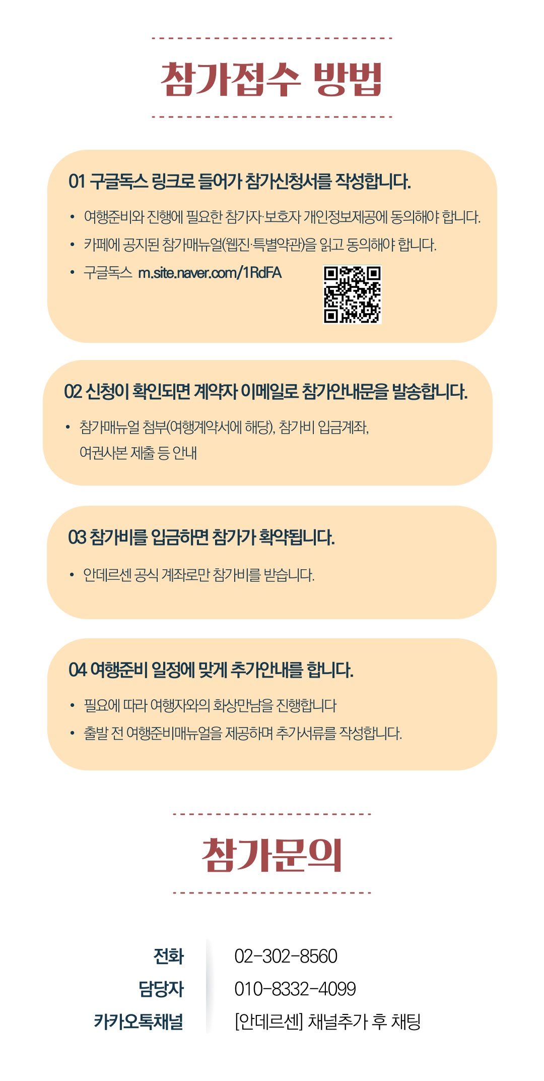 상세한 여행준비를 위해 구글 참가신청서를 작성해주셔야 합니다. 구글독스 참가신청서를 작성하지 않으면 정상적으로 예약이 접수되지 않습니다. 클릭하면 바로 구글 참가신청서로 연결됩니다.