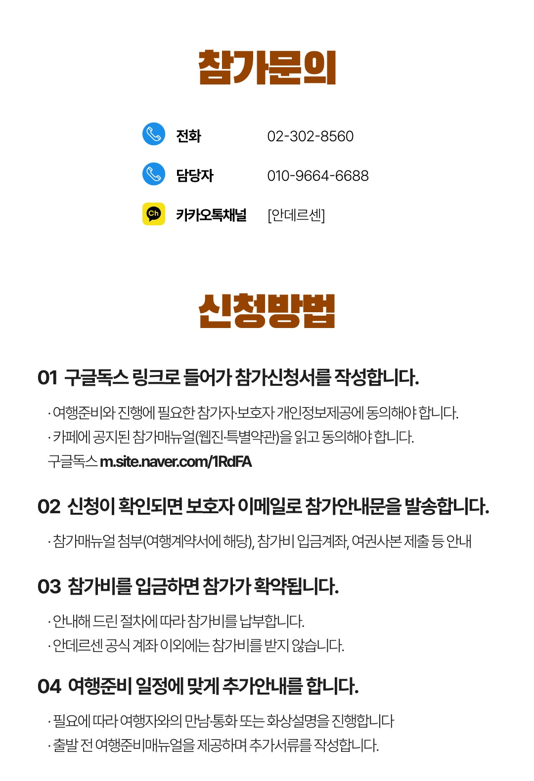 상세한 여행준비를 위해 구글 참가신청서를 작성해주셔야 합니다. 구글독스 참가신청서를 작성하지 않으면 정상적으로 예약이 접수되지 않습니다. 클릭하면 바로 구글 참가신청서로 연결됩니다.