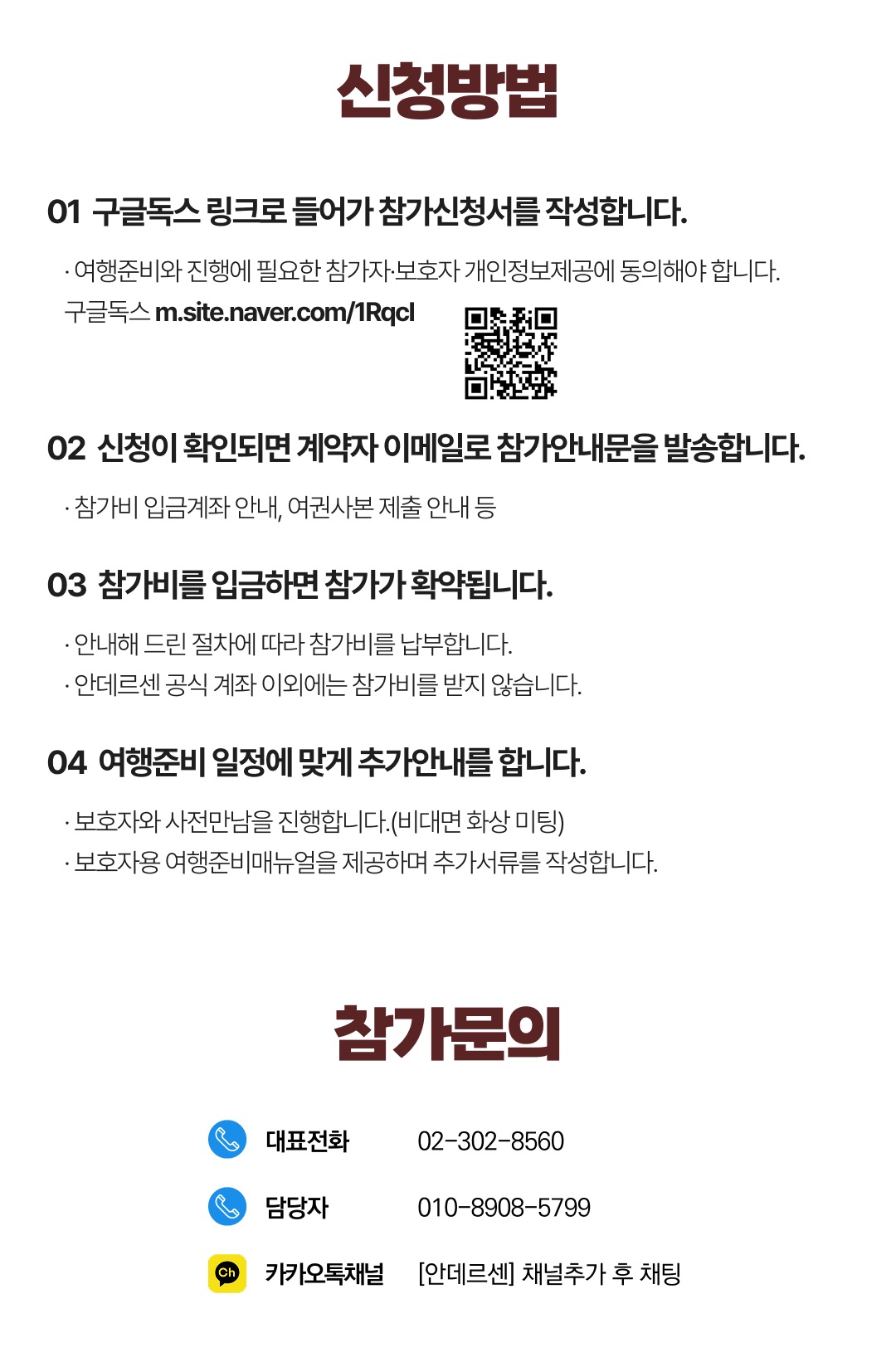 상세한 여행준비를 위해 구글 참가신청서를 작성해주셔야 합니다. 구글독스 참가신청서를 작성하지 않으면 정상적으로 예약이 접수되지 않습니다. 클릭하면 바로 구글 참가신청서로 연결됩니다.