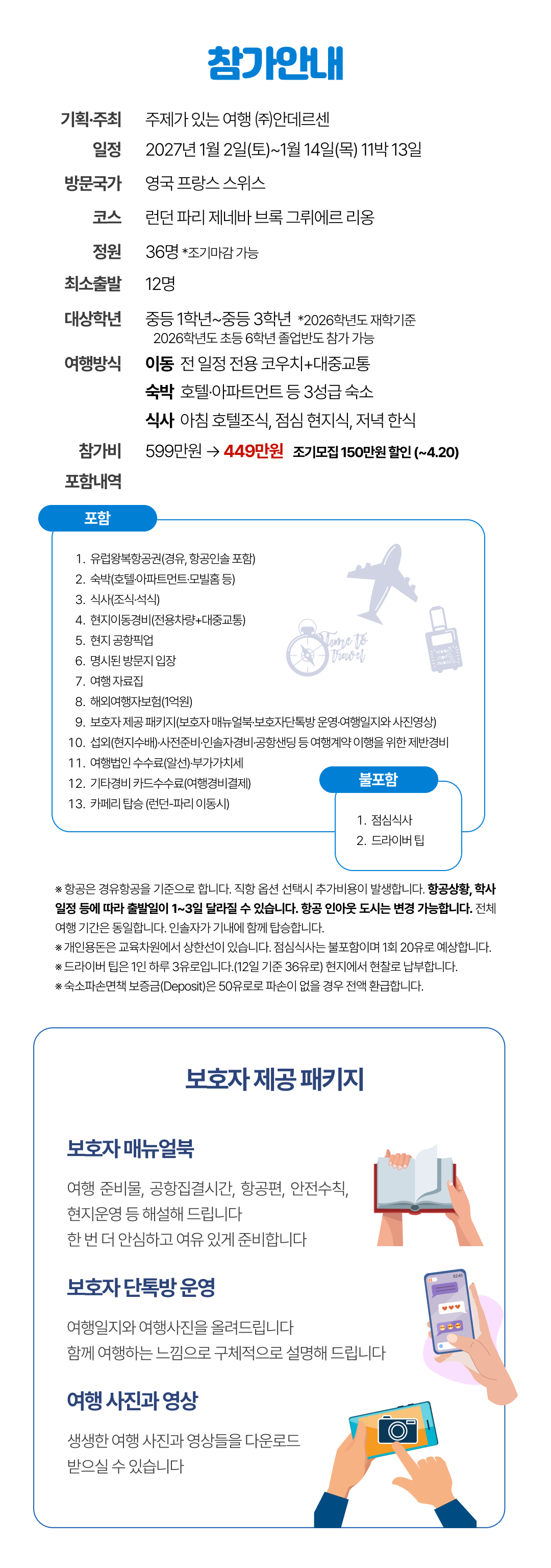 안전한 여행을 위해 주최측은 외교부 해외안전여행, 현지언론보도 등을 예의주시하며 예기치 않은 상황발생시에도 빠르게 조치를 취하고 있습니다. 이와 별도로 여행참가 전 해당 방문국의 여행안전경보, 예방접종 등과 관련해서는 보호자와 여행자 각자가 판단해야 합니다. 외교부 해외안전여행, 해외여행 질병정보 등의 사이트를 확인바랍니다. 어플을 설치하셔서 실시간 확인하는 것이 좋습니다. 비의료인은 의료조치를 할 수 없습니다. 주최측은 예방접종 등 의료적 권고는 하지 않습니다. 여행자가 스스로 판단해 진행 바랍니다.