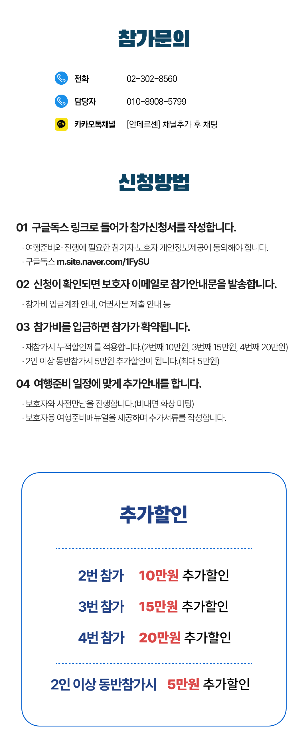 상세한 여행준비를 위해 구글 참가신청서를 작성해주셔야 합니다. 구글독스 참가신청서를 작성하지 않으면 정상적으로 예약이 접수되지 않습니다. 클릭하면 바로 구글 참가신청서로 연결됩니다.