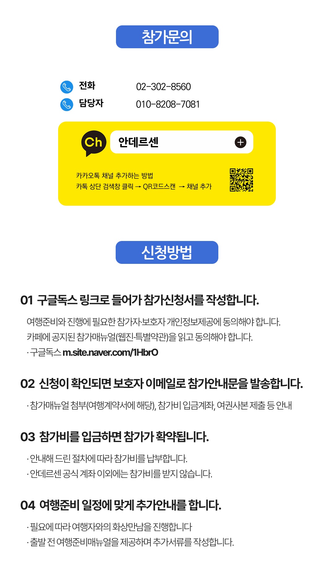 상세한 여행준비를 위해 구글 참가신청서를 작성해주셔야 합니다. 구글독스 참가신청서를 작성하지 않으면 정상적으로 예약이 접수되지 않습니다. 클릭하면 바로 구글 참가신청서로 연결됩니다.