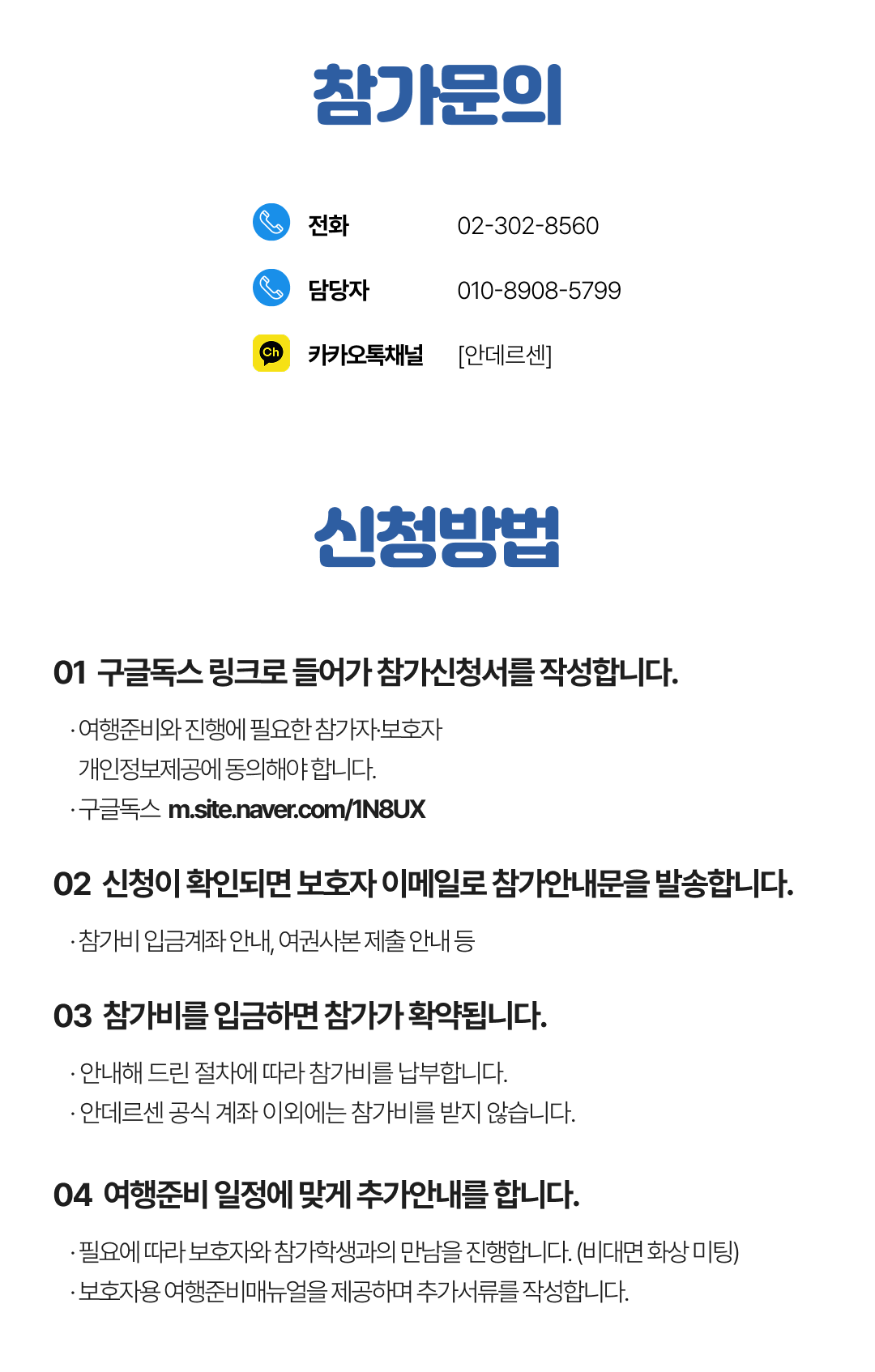 상세한 여행준비를 위해 구글 참가신청서를 작성해주셔야 합니다. 구글독스 참가신청서를 작성하지 않으면 정상적으로 예약이 접수되지 않습니다. 클릭하면 바로 구글 참가신청서로 연결됩니다.